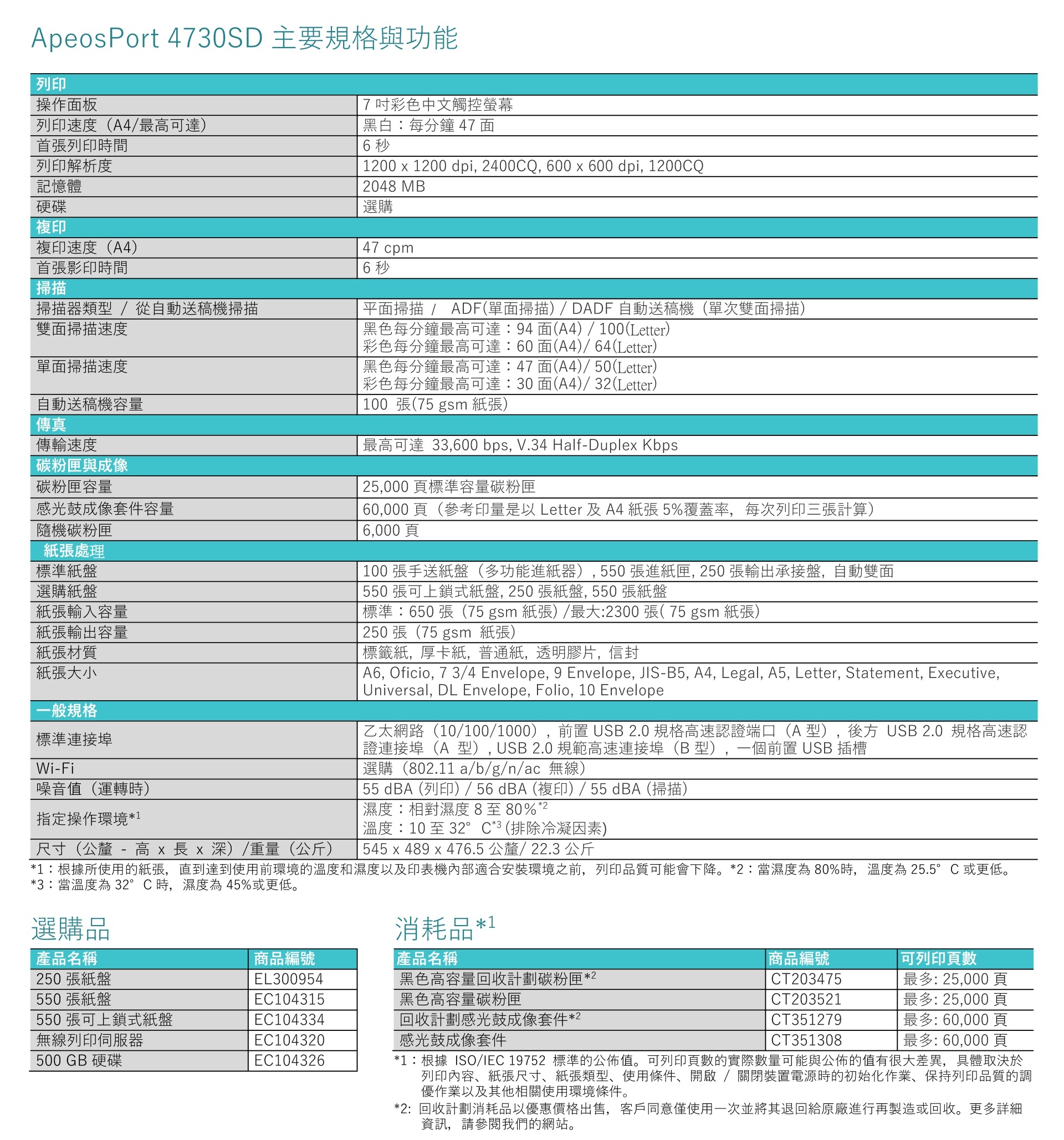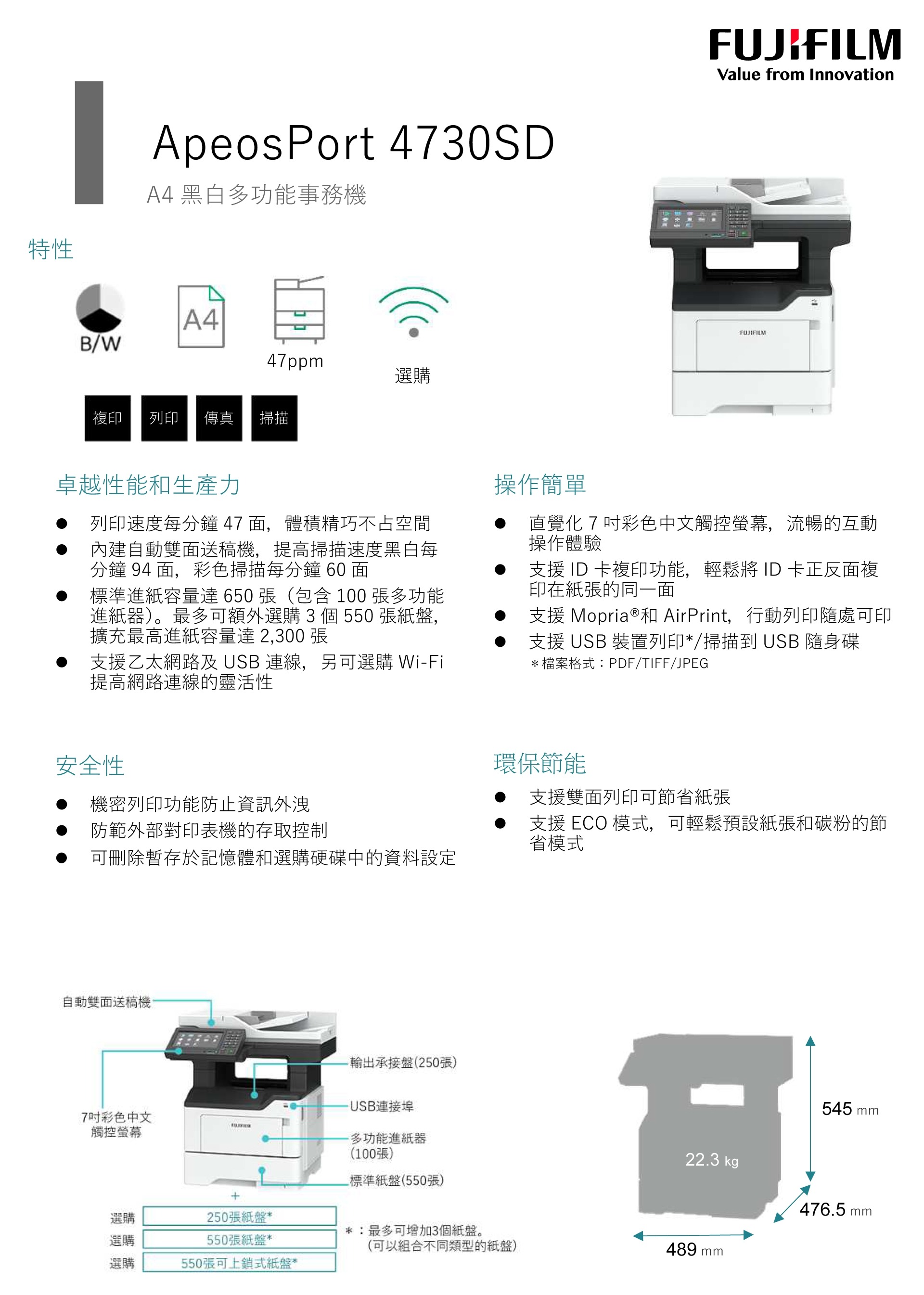 FUJIFILM 富士軟片 ApeosPort 4730SD A4黑白雷射多功能事務機(AP4730SD)|列印、影印、彩掃、傳真