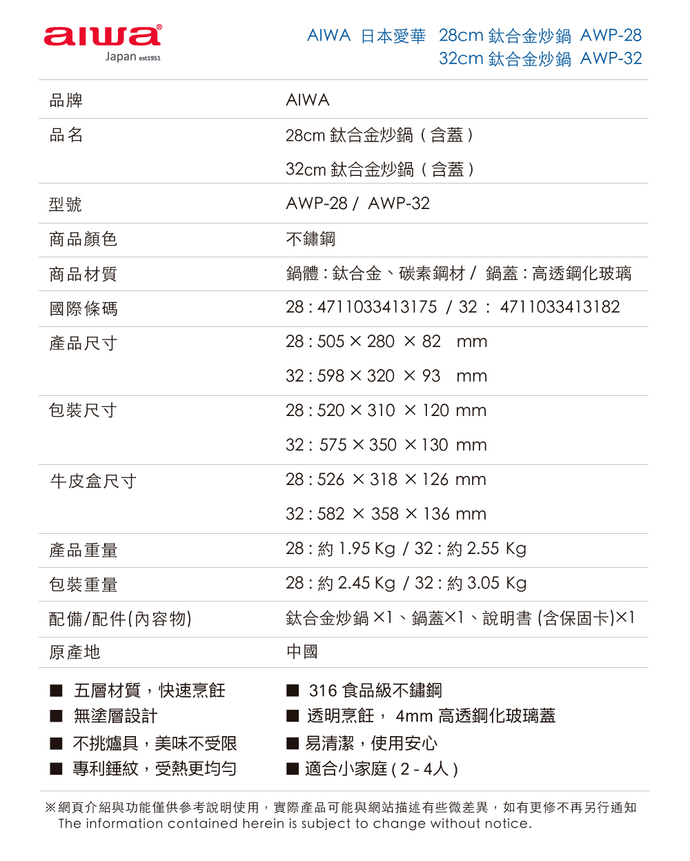 重量:(28cm)2.45kg / (32cm)3.05kg
