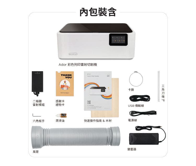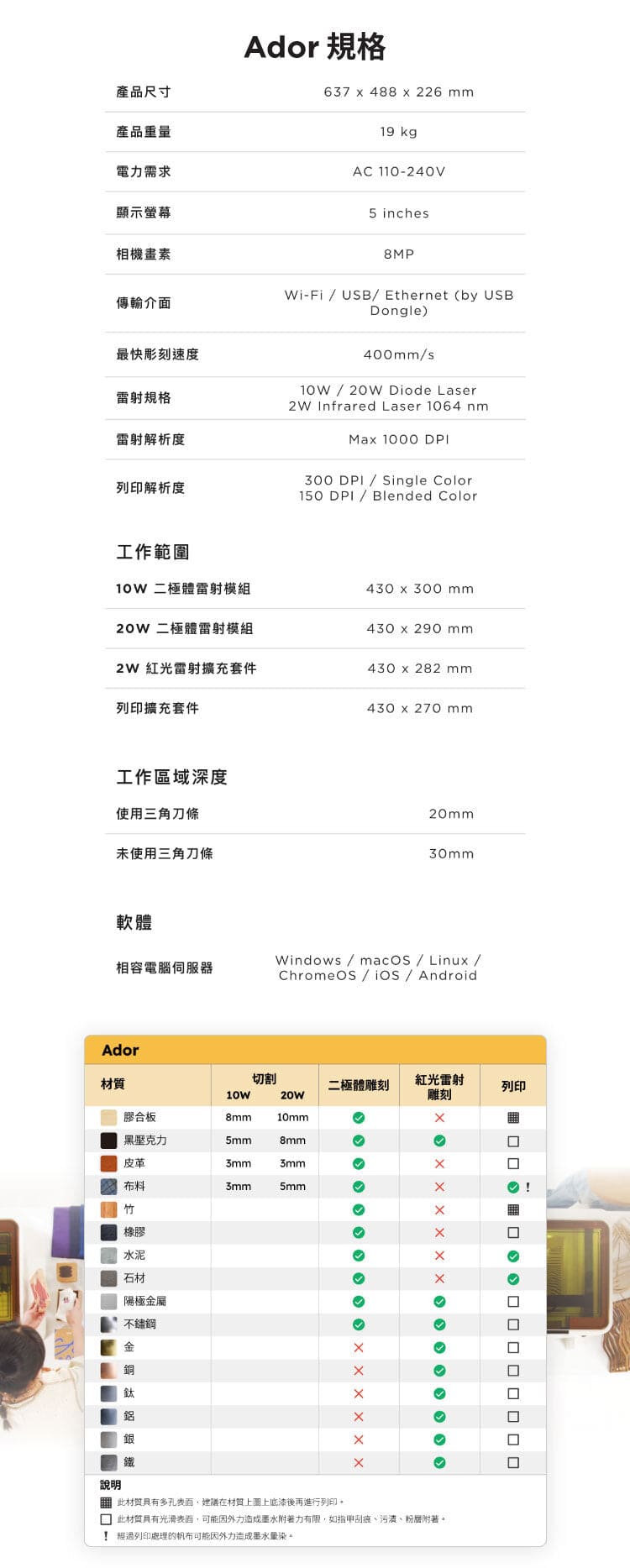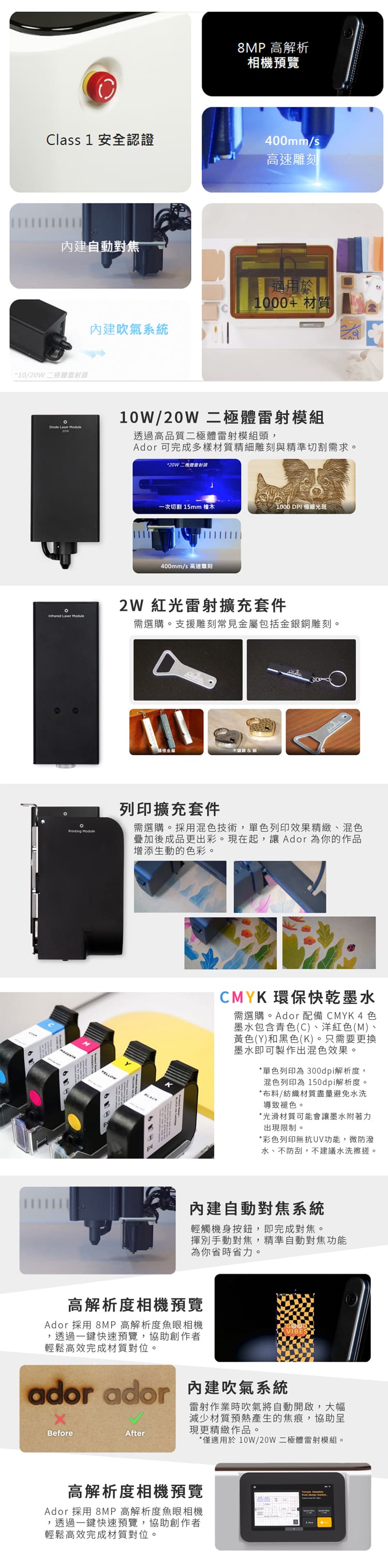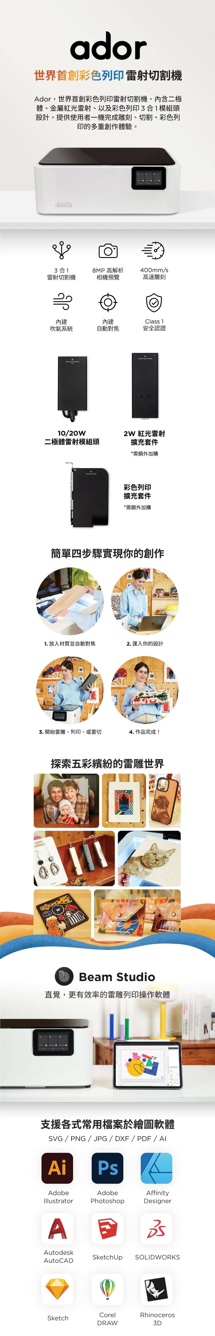 Ador,世界首創彩色列印雷射切割機,內含二極體、金屬紅光雷射、以及彩色列印 3 合 1模組頭設計,提供使用者一機完成雕刻、切割、彩色列印的多重創作體驗。