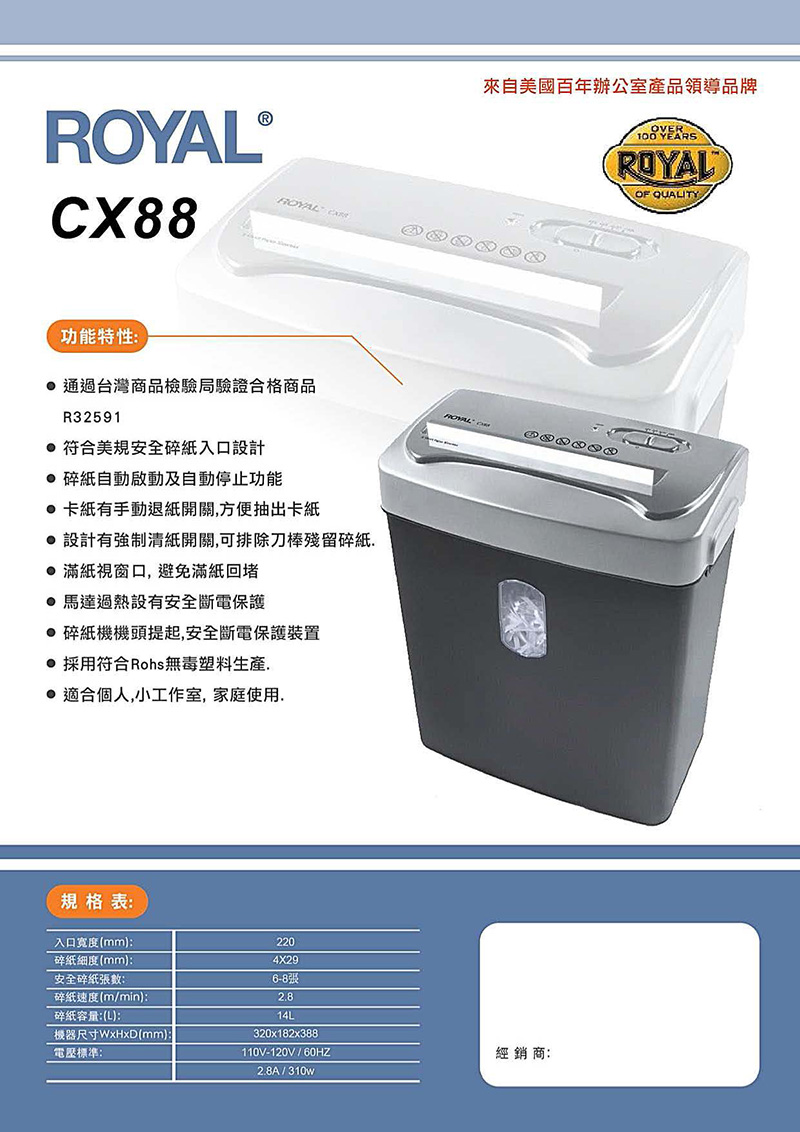 ◆品名:ROYAL經濟型短碎型碎紙機 CX88