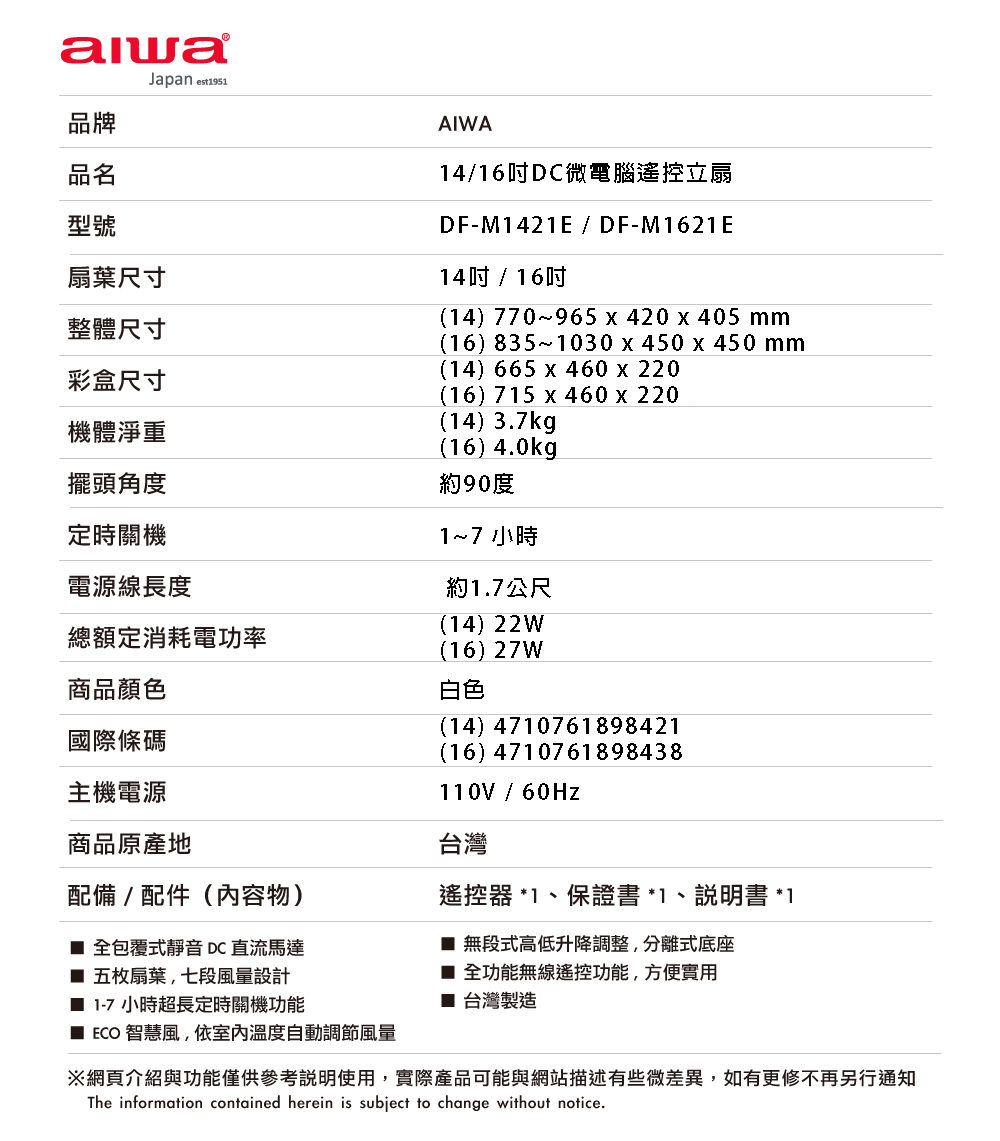 扇葉尺寸:14吋 / 16吋