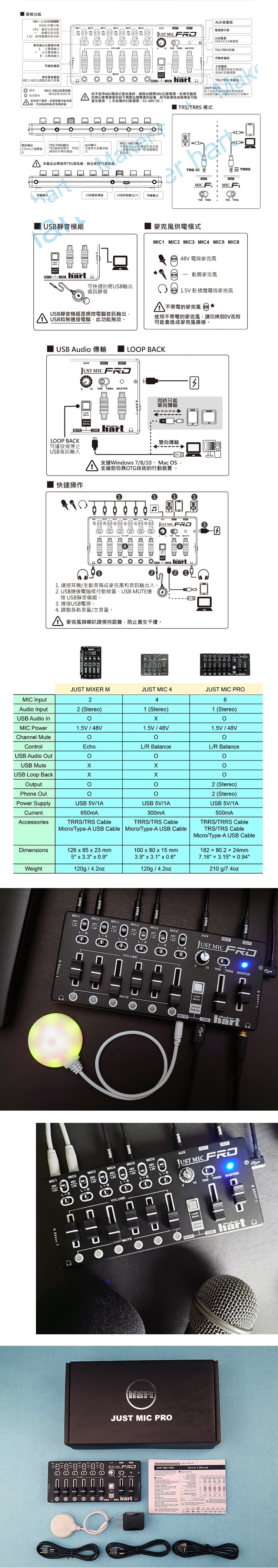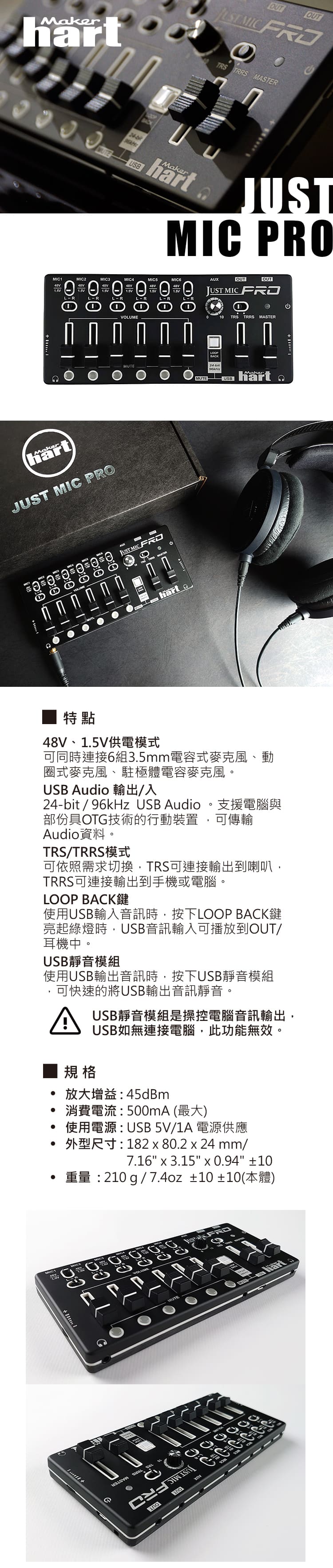 ■ 48V、1.5V供電模式 : 可同時連接6組3.5mm電容式麥克風、動圈式麥克風、駐極體電容麥克風。