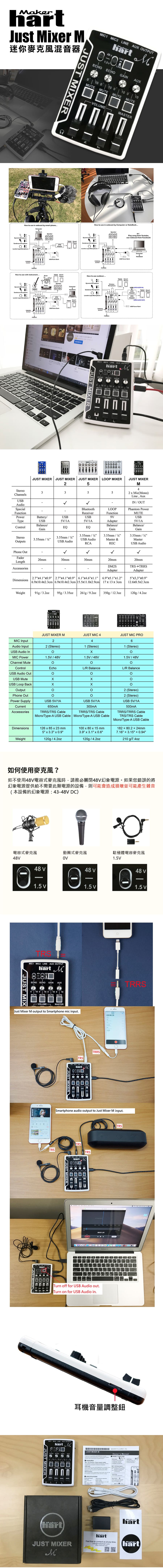 ■ USB Audio 傳輸-使用USB線連接JUST MIXER M到電腦,支援部份具OTG技術的行動裝置 ,可傳輸Audio資料。※ USB Audio取樣頻率 : 96KHz/24bits.