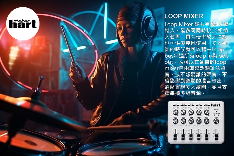 ■ 迴路裝置-透過迴路排線可串接多組LOOP MIXER,可在各自的迴路LOOP MIXER上調整監聽其他裝置的聲音音量,且不影響到整體混音效果。