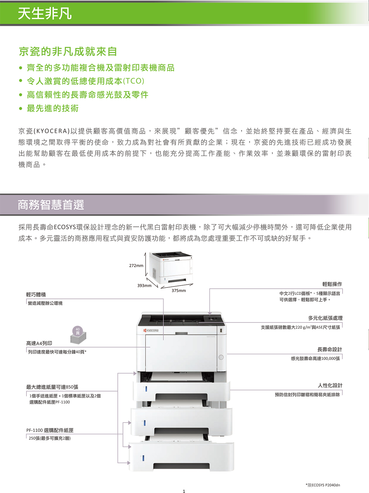 採用長壽命零件及感光鼓設計,實現低總使用成本(TCO)