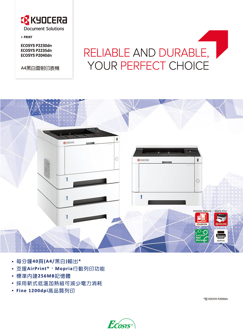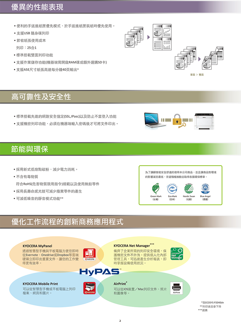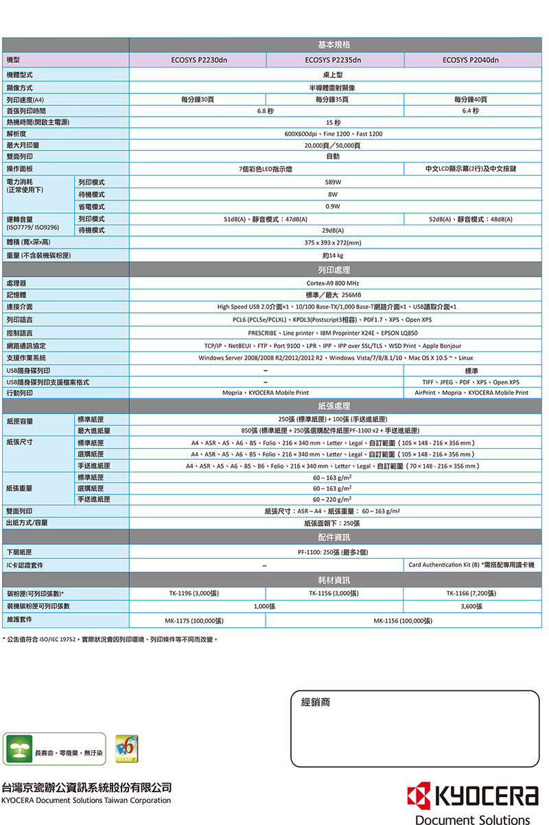 ■ 列印語言:PCL6 (PCL5e/PCLXL)、KPDL3(Postscript3相容)、PDF1.7、XPS、Open XPS