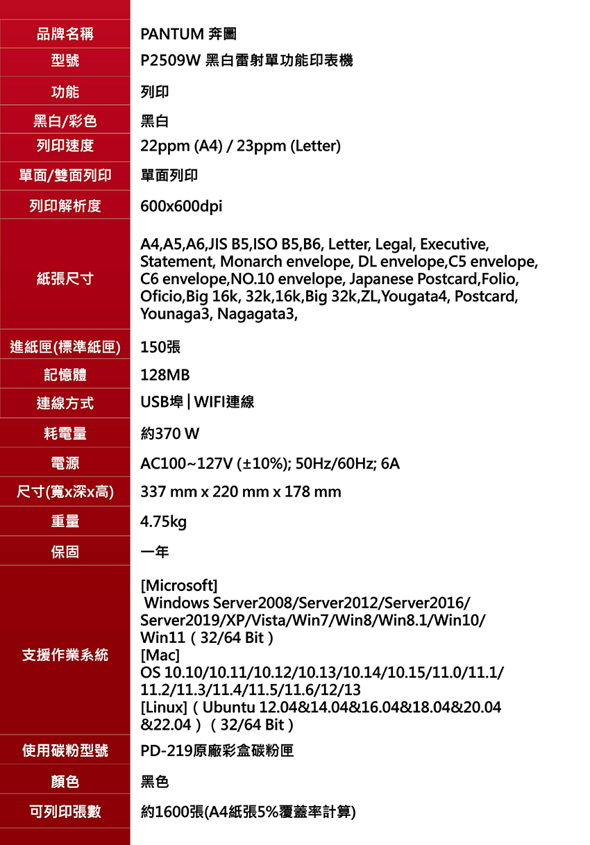奔圖 Pantum P2509W 黑白無線雷射印表機|學生家用推薦|適 PD-219