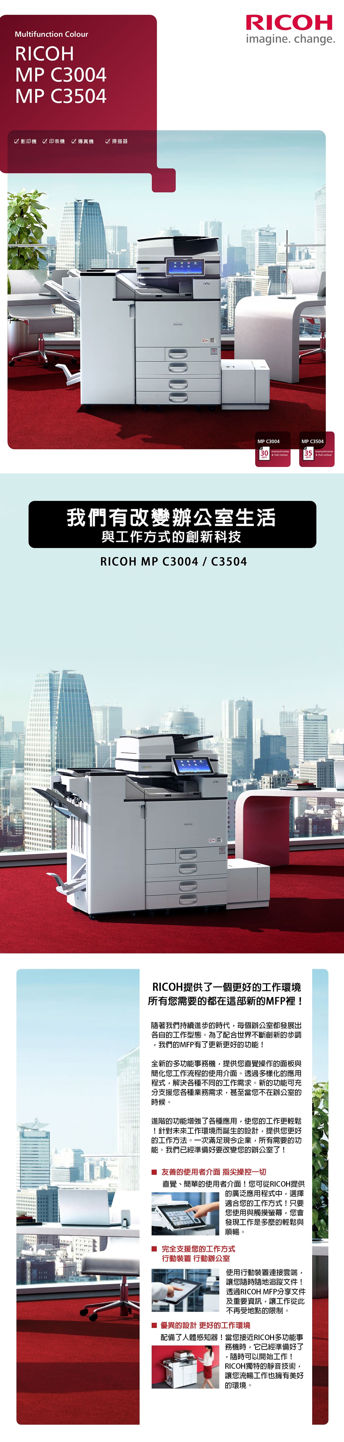 RICOH MP C3504 以及簡化您工作流程的使用者介面。多樣化的應用程式,能解決各種不同的工作需求。而新的功能能充分的支援您各種的業務需求,甚至當您不在辦公室的時候。