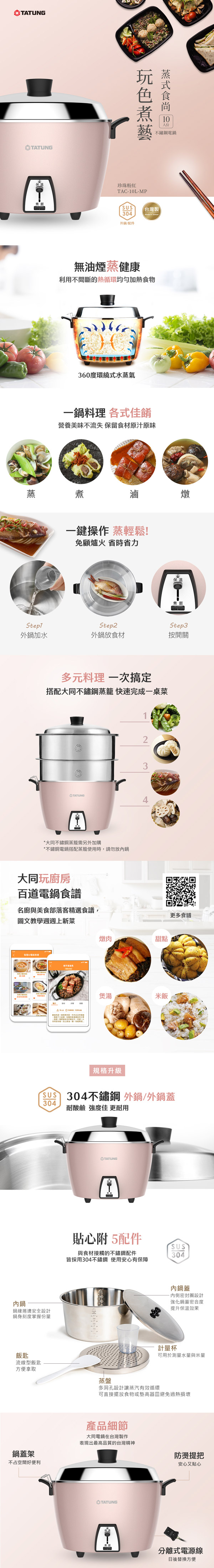 鍋蓋、內鍋、蒸盤均為SUS 304 不鏽鋼