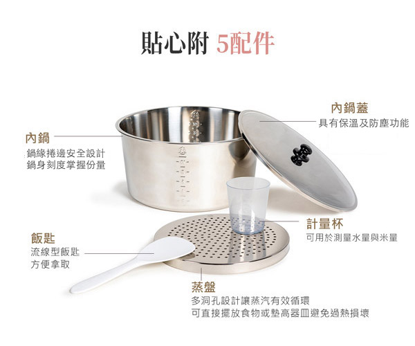 ◎電鍋外鍋:鋁合金,其餘全配件 外鍋蓋、內鍋蓋、內鍋、蒸盤 皆為SUS304不鏽鋼