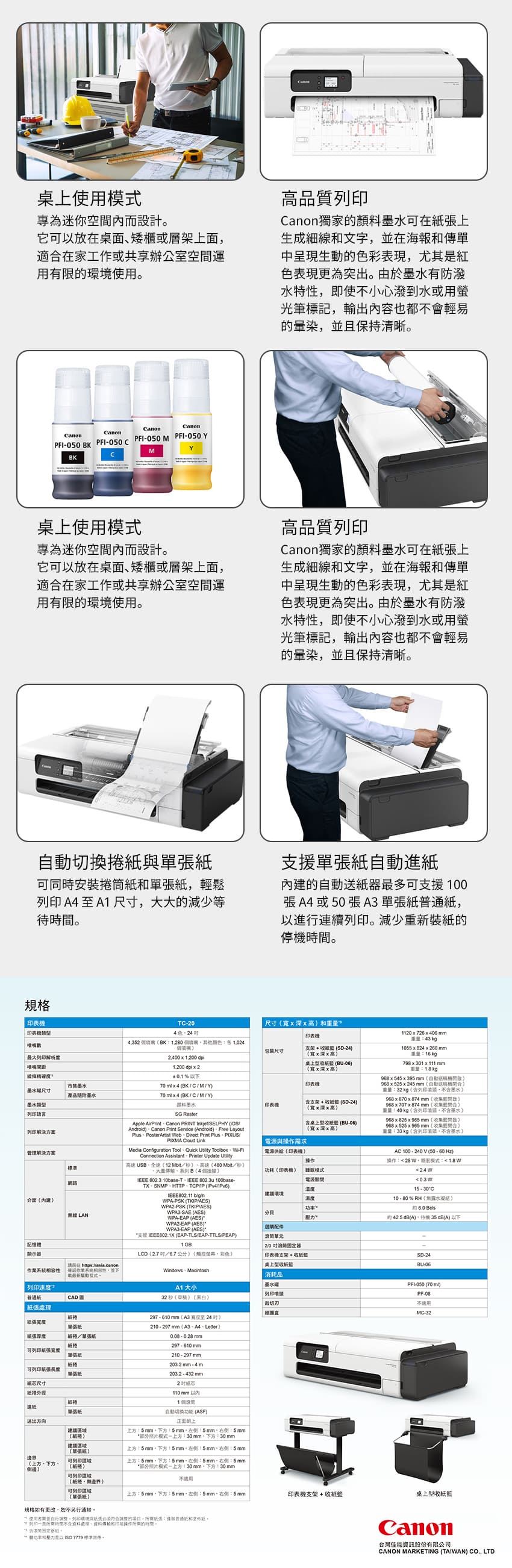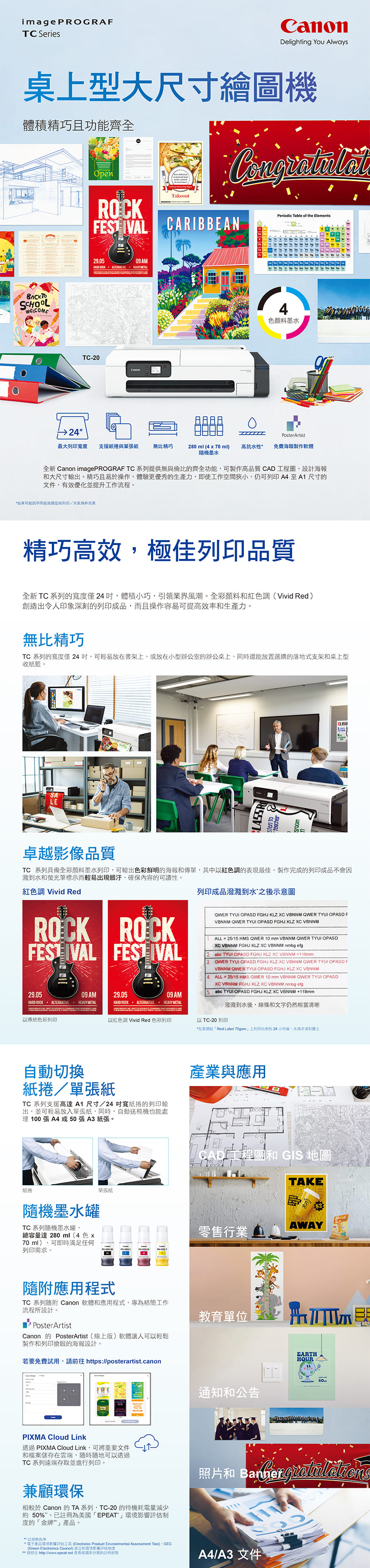 CANON imagePROGRAF TC-20 桌上型大尺寸繪圖機 繪圖列印機 大圖輸出 支援A4/A3/A1列印