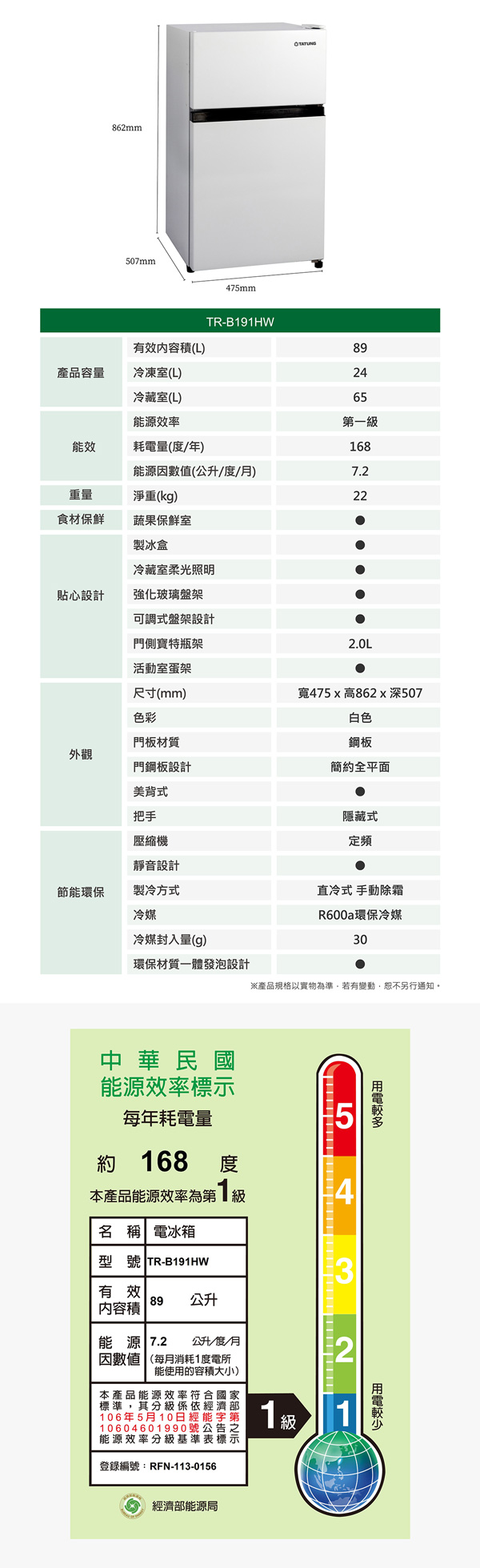 耗電量:168度/年