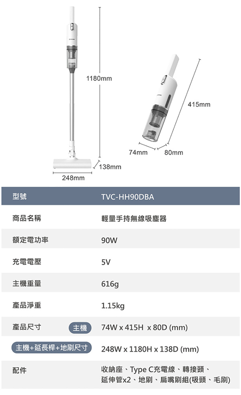 配件:收納座、Type C充電線、轉接頭、延伸桿*2、地刷、扁嘴刷組