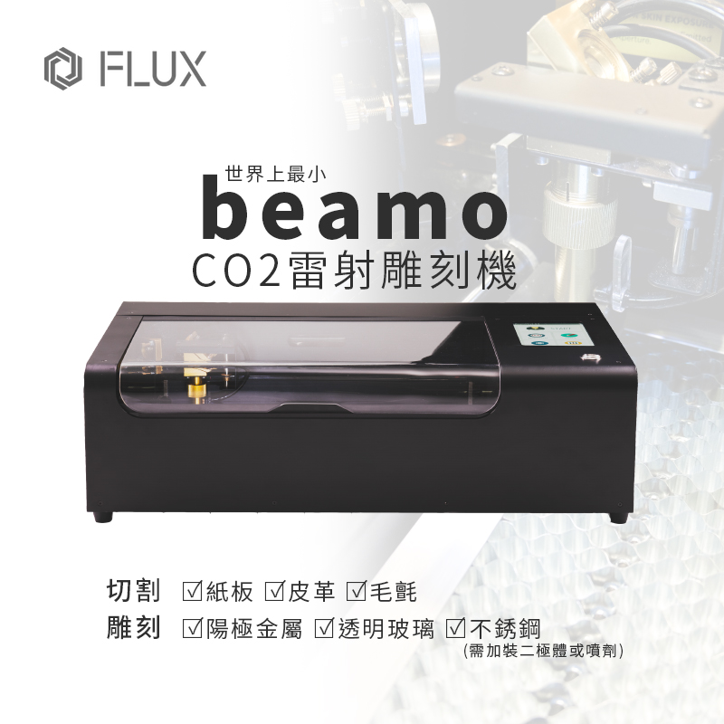 beamo 是搭載 30W CO2 雷射的雷射切割機,可切割與雕刻木頭、皮革、壓克力、紙張等常見材料,搭配簡單易懂的軟體,讓實現創意成為一件簡單的事。beamo 運用的檔案為大家很熟悉的 2D 檔案格式,如 JPG、PNG、SVG、DXF、AI及PDF 等。